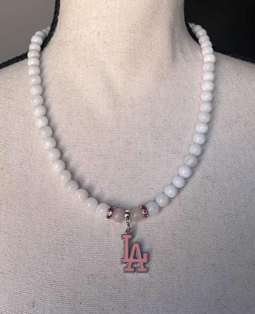Show your Los Angeles pride with this stylish LA Baseball Necklace, crafted from genuine White and Rose quartz gemstones. Each stone bead is polished to a smooth finish, symbolizing luck, confidence, and prosperity—qualities every true fan carries into the game.
